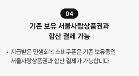 기존에 보유하고 있는 서울사랑상품권이 있다면, 이번 민생회복 소비쿠폰과 합산해 함께 사용할 수 있습니다.